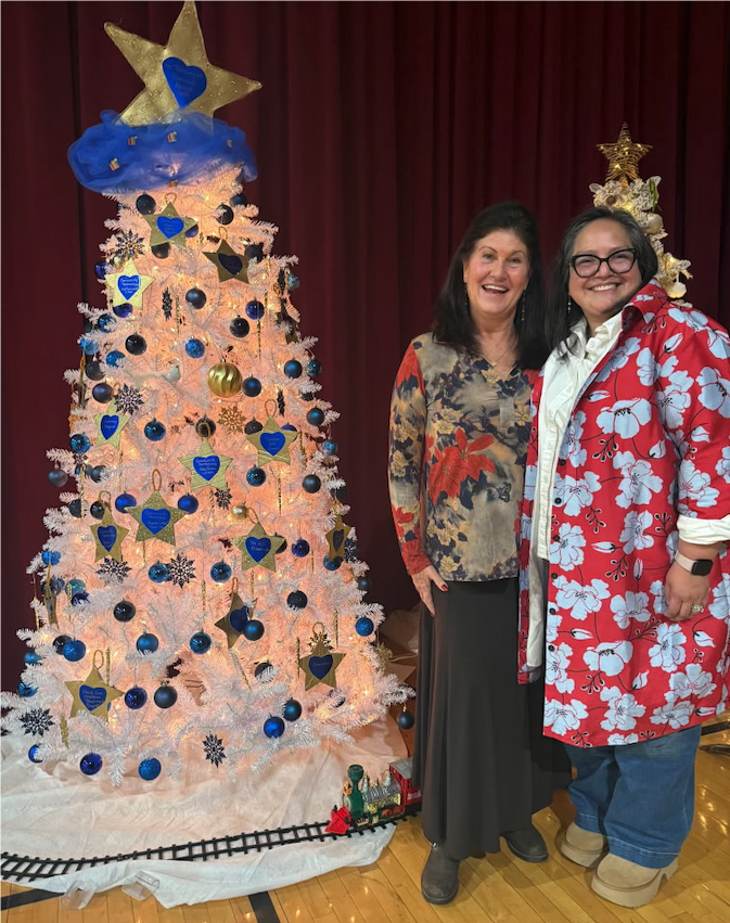 Rotarians Lisa Scott and Sandy Douthey stand beside the Rotary Christmas Tree, inspired by Sandy’s vision to highlight Rotary’s spirit of service and its guiding value of Service Above Self. 🎄✨